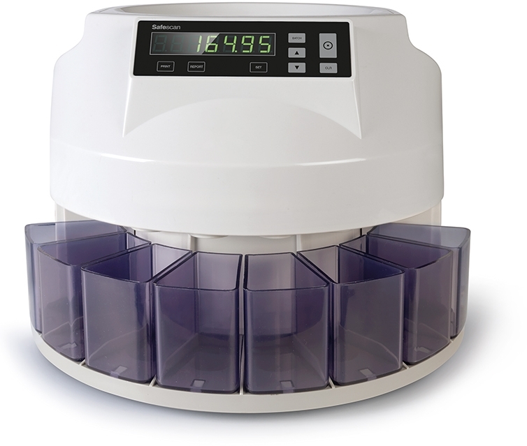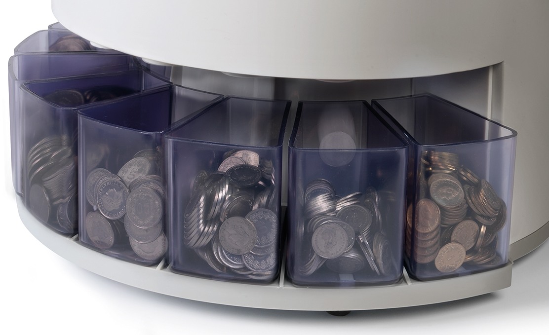 Zählt und sortiert 220 Münzen pro Minute • Münzaufnahme: 300-500 Münzen • Mit Additionsfunktion • Gesamtwert und Stückzahl pro Nennwert • Selbstabschaltend, wenn Münzbehälter voll ist • Währung: Schweizer Franken • Gewicht: 5 kg