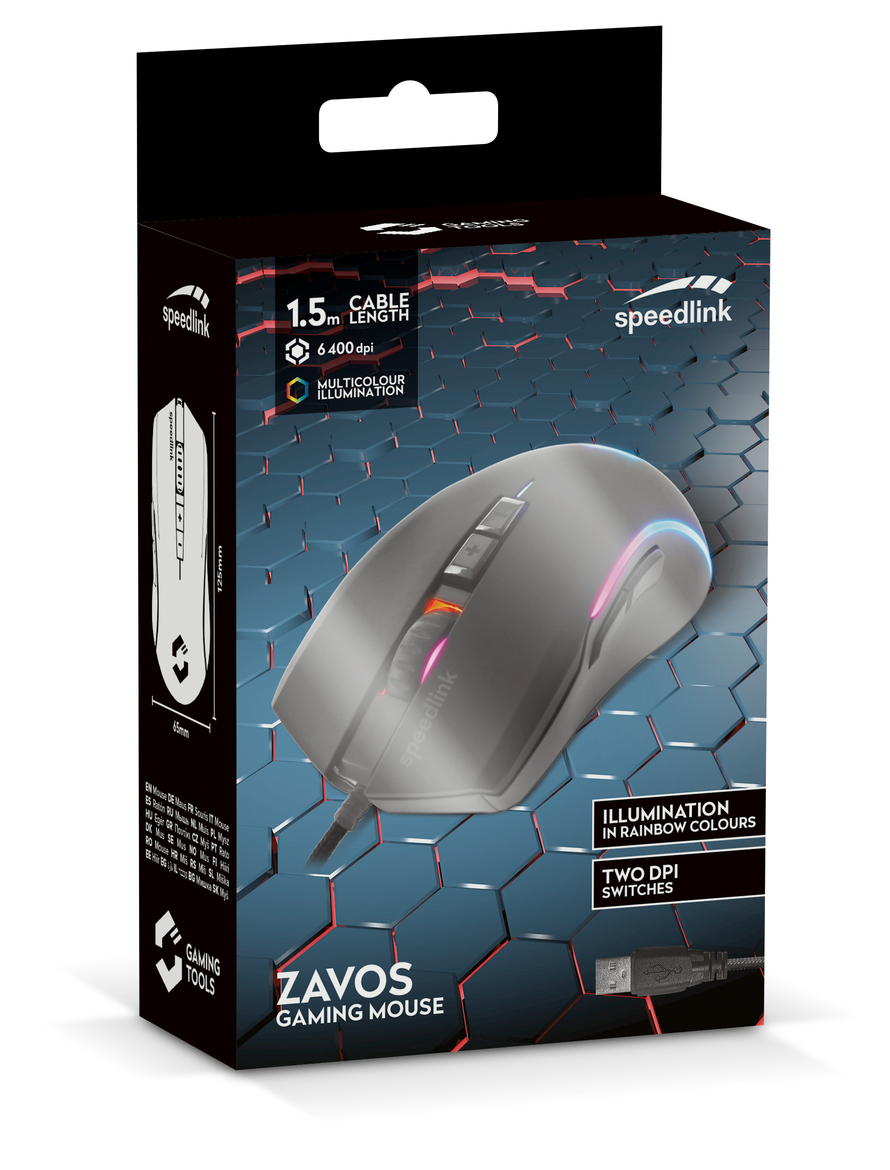 Vielseitigkeit, Präzision und Stil sind die Hauptmerkmale der ZAVOS Gaming Mouse. Das klare Design ermöglicht eine effiziente sowie intuitive Handhabung und wird von einer regenbogenfarbenen Beleuchtung komplementiert. Dank der fünf Tasten und zwei dpi-Schaltern ist die Maus vielseitig einsetzbar und eignet sich besonders für schnelle Action. Die maximale Sensorauflösung von 3.200dpi (oder 6.400dpi interpoliert) gewährleistet absolute Präzision und Feinfühligkeit, damit auch die kleinsten Ziele sicher anvisiert werden können. Aufgrund der gummierten Oberfläche der ZAVOS ist selbst bei schweisstreibenden Missionen der perfekte Griff jederzeit garantiert. Das 1,5 Meter lange, ummantelte Kabel ist robust, elegant und lässt genügend Freiraum für Manöver aller Art.
