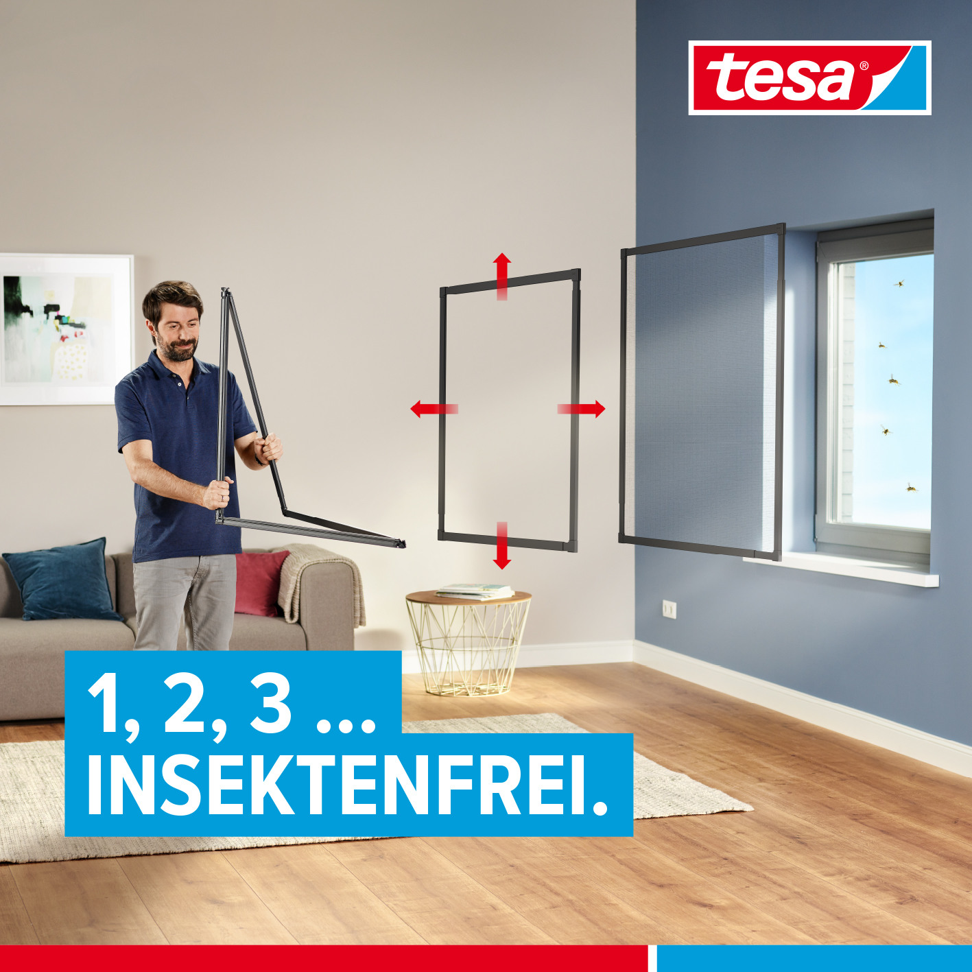 tesa® Insect Stop FALT - faltbarer Alu-Rahmen, teleskopierbar ist die langfristige Lösung, wenn es um Insektenschutz geht. Er ist das am einfachsten zu montierende und zudem frei einstellbare tesa® Fliegengitter für Fenster. Deshalb wird ausser einer Schere für die Montage nichts benötigt. Nur vier Montage-Schritte für das Fliegengitter ohne Bohren: 1. Rahmen entfalten 2. Teleskopprofile auf Mass schieben & fixieren 3. das Netz einpassen 4. Insektenschutz ins Fenster einhängen – fertig! Zudem sorgt das Clear View Ultra-Gewebe des tesa® Fliegengitters für bessere Durchsicht und Belüftung.