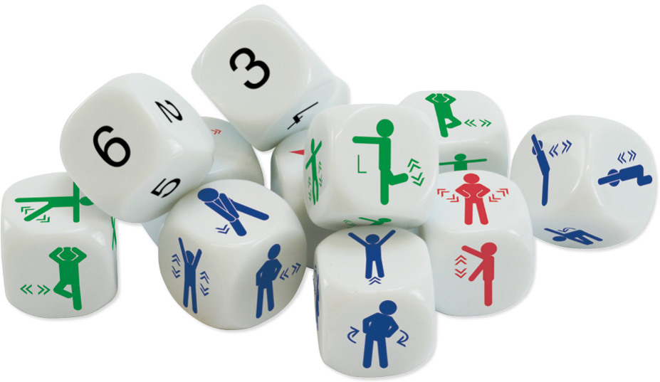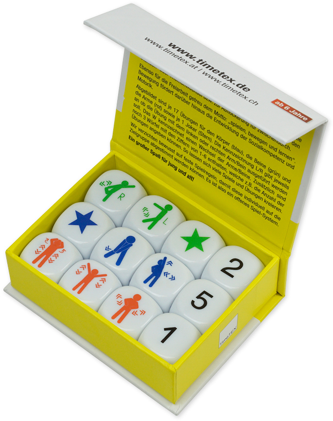 Insgesamt 12 sechsseitige Würfel mit denen Bewegung in den Unterricht kommt, weil sie sich hervorragend für den Stundenwechsel, zur Auflockerung des Unterrichts oder zur Steigerung der Konzentrationsfähigkeit eignen. Ebenso gut lassen sich die Würfel als kleines Spiel für zwischendurch oder im Sport-Unterricht einsetzen. Je nach Jahrgangsstufe würfeln die Schüler mit einem oder mehreren Würfeln, womit auch anspruchsvollere Aufgaben gebildet werden können. Zur leichteren optischen Unterscheidung sind die Würfel für Übungen der Arme (rot), Beine (grün) und des Körpers (blau) pro Version unterschiedlich farbig gestaltet. Mit dieser optischen Unterscheidung ist eine schnelle Auswahl und punktgenaue Aufgabenstellung möglich. Die Würfel werden in einer praktischen Box geliefert, die farbigen Piktogramme sind auf den weissen Würfeln besonders gut zu erkennen. Aus den oben liegenden Würfelfeldern wird eine Übungsaufgabe gebildet. Hierbei kann es sich, je nach Auswahl und Anzahl der Würfel, um Übungen für die Arme, Beine oder des Körpers handeln. In Kombination mit den Ziffern-Würfeln kann die Anzahl der jeweiligen Übung bestimmt werden. Das Würfel-Set ist für alle Altersgruppen von jung bis alt gut einsetzbar. Der Schwierigkeitsgrad kann verändert werden, indem man die Anzahl der Würfel erhöht und reduziert. Neben Übungen für die ganze Klasse auch für Einzel-, Paar- oder Gruppenarbeit oder zur Beschäftigung von einzelnen Schülern geeignet. Eine Anleitung auf der Deckel-Innenseite informiert über vielfältige Einsatzmöglichkeiten. Die Würfel sind in einer sehr schönen, robusten und haptisch angenehmen Klapp-Box aus Pappe mit Magnet-Verschluss untergebracht. Dadurch lässt sich die Klapp-Box leicht öffnen/schliessen und die Handhabung wird sehr erleichtert. Inhalt: je 3 Würfel mit Übungen für die Arme, Beine und den Körper sowie 3 Ziffern-Würfel 1-6