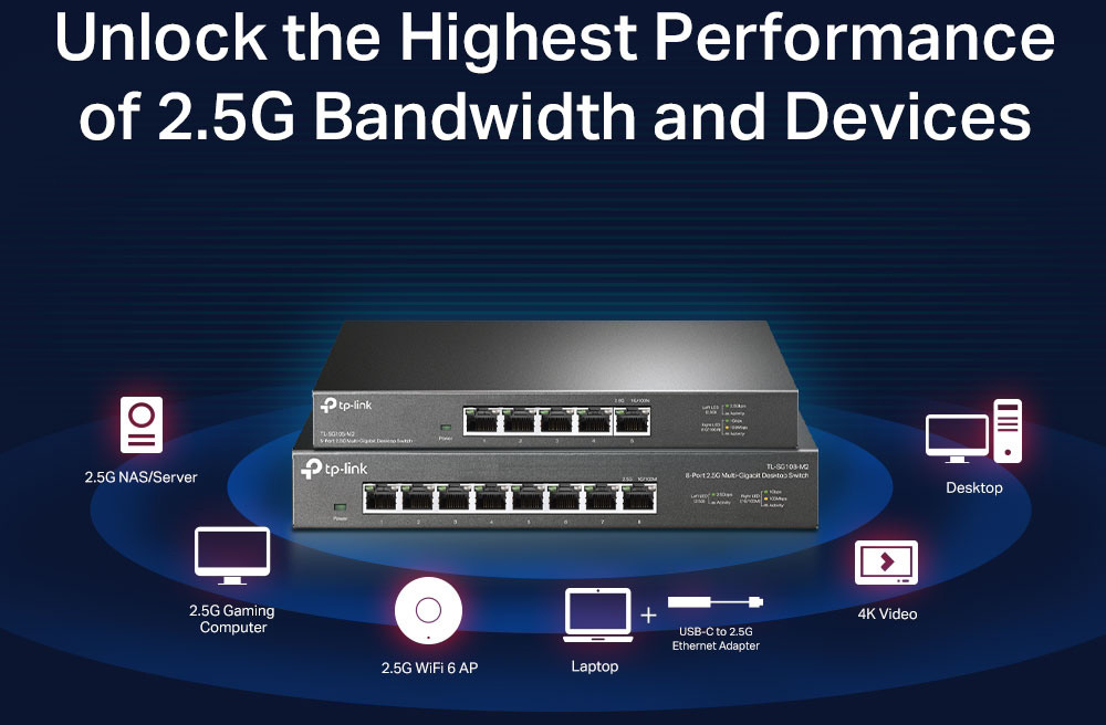Schalten Sie die höchste Leistung von 2,5-G-Multi-Gig-Bandbreite und -Geräten frei. Als Flaggschiff der 2.5G-Produkte bieten die 5/8-Port-Desktop-Switches mit 5/8 × 2,5-Gigabit-Ports die höchste Leistung Ihrer Multi-Gig-Bandbreite und -Geräte und bieten eine Switching-Kapazität von bis zu 25/40 Gbit/s. 3-Gang-Verbindungen (100 MB / 1G / 2,5G) mit automatischer Aushandlung erfassen die Verbindungsgeschwindigkeiten und passen sich intelligent an die Kompatibilität und optimale Leistung aller Ihrer Geräte an, einschliesslich 2,5G NAS, 2,5G PCIe-Adapter, Spielekonsole, VR-Gaming, 2,5G WiFi 6 AP, 4K-Video, Desktop und mehr.