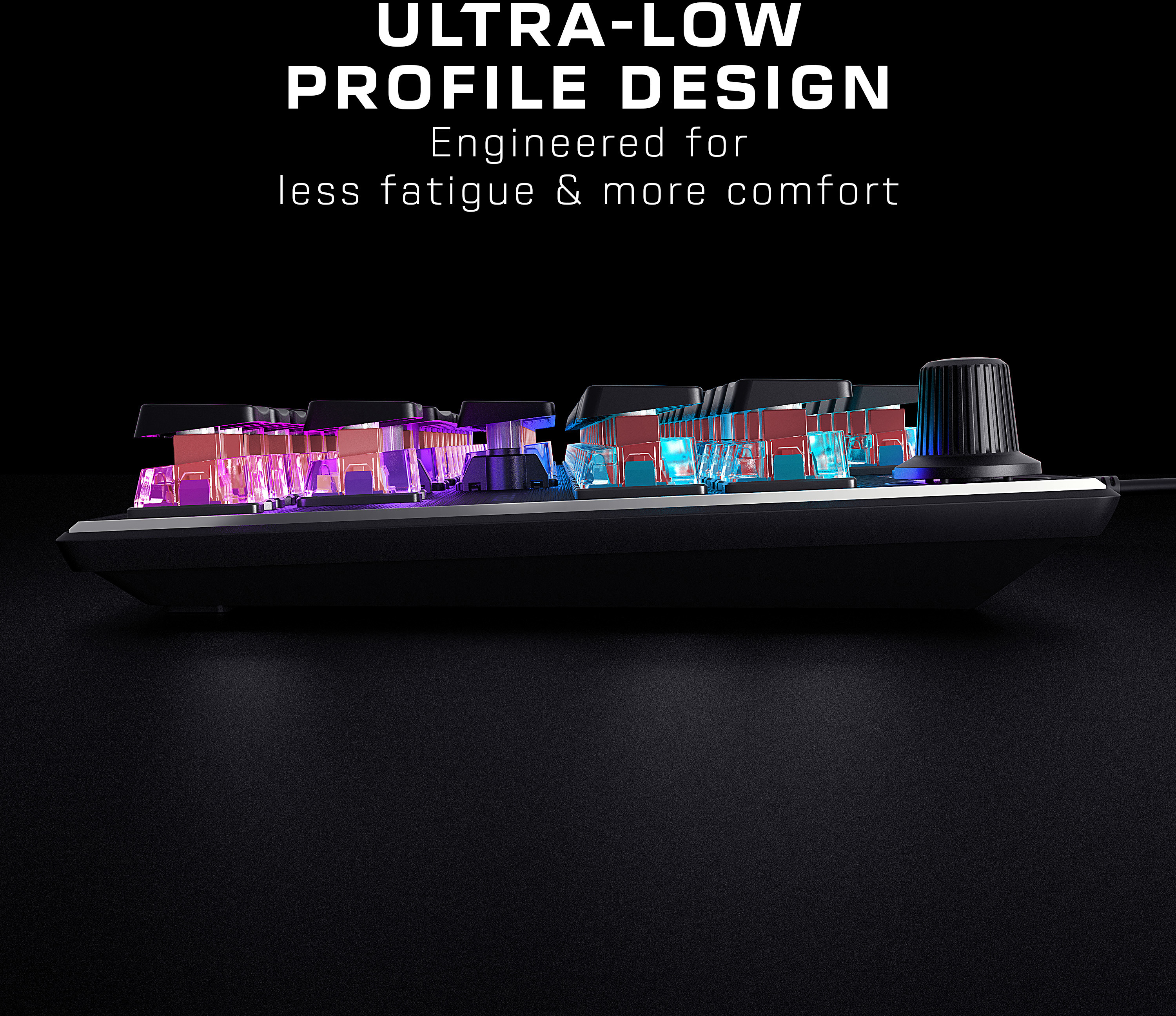 Die Turtle Beach® Vulcan TKL ist eine zehnertastaturlose Variante der preisgekrönten Vulcan-Tastaturfamilie. Dieser kleinere Formfaktor bedeutet, dass Gamer Platz für ein grösseres Pad haben und eine grössere Bandbreite an Mausbewegungen nutzen können, was letztendlich zu einer höheren Genauigkeit führt. Der lineare TITAN Switch Mechanical ist die branchenweit beste Kombination aus Geschwindigkeit und Reaktionsfähigkeit. Der Schalter ergänzt die umfassenden Funktionen, die Gamer kennen und lieben. Das flache Design ist auf Komfort und Ermüdungsfreiheit ausgelegt. Beeindruckende Langlebigkeit und Verarbeitungsqualität dank der verstärkenden, schwarz eloxierten Aluminium-Oberplatte, Schaltern mit einer Lebensdauer von 50 Millionen Anschlägen, dedizierten Audiosteuerungen im Mixer-Stil und AIMO™ RGB-Beleuchtung.